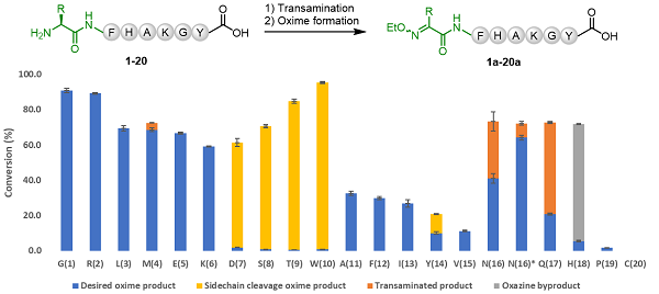 蛋白质的N-端-α胺基相较于赖氨酸的ε胺基有较低的pKa,因而更具有亲核性,是蛋白质定点修饰的理想位点。在自然界中,铜胺氧化酶催化酪氨酸的侧链酚基被氧化成邻醌,邻醌可将体系内的一级胺氧化成醛,酮基。受此启发,作者发展了蛋白质仿生转氨化的方法(图1)。作者通过筛选多种邻醌类化合物与模板肽进行反应,发现邻醌试剂在pH 6.5 的缓冲水溶液中具有最高的活性,能在两小时内将N-端为甘氨酸的模板肽8转换为醛,随后与乙氧基胺作用产生更稳定的肟产物9,两步总转换率达到91%,而模板肽中的赖氨酸ε胺基在该反应条件下产生的副反应低于1%。该氧化条件适用于N-端为精氨酸、亮氨酸,赖氨酸,甲硫氨酸、谷氨酸,天门冬氨酸、丝氨酸、苏氨酸、色氨酸和天门冬酰胺等多肽的修饰,均能以高产率获得修饰多肽(图2)。