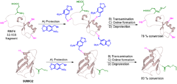 随后,该方法被应用于蛋白质目标物泛素及肌红蛋白的修饰,均能以70%以上的转化率得到目标肟产物及生物素标记的肌红蛋白修饰产物。由于反应条件对蛋白序列中游离的半胱氨酸巯基并不耐受,作者进而发展了光敏保护基策略,即先将蛋白质中游离的半胱氨酸与小分子2-硝基胡椒苄溴反应而被选择性保护,随后进行转胺化反应,最后通过光解脱除保护基,即得到目标修饰蛋白质。整个反应过程中不需额外分离手段,只需通过简单萃取去除小分子反应物即可,从而最大限度地维持了蛋白质的三级结构。作者将该策略成功应用于含游离半胱氨酸的SUMO2和RNF4蛋白质的转胺化。