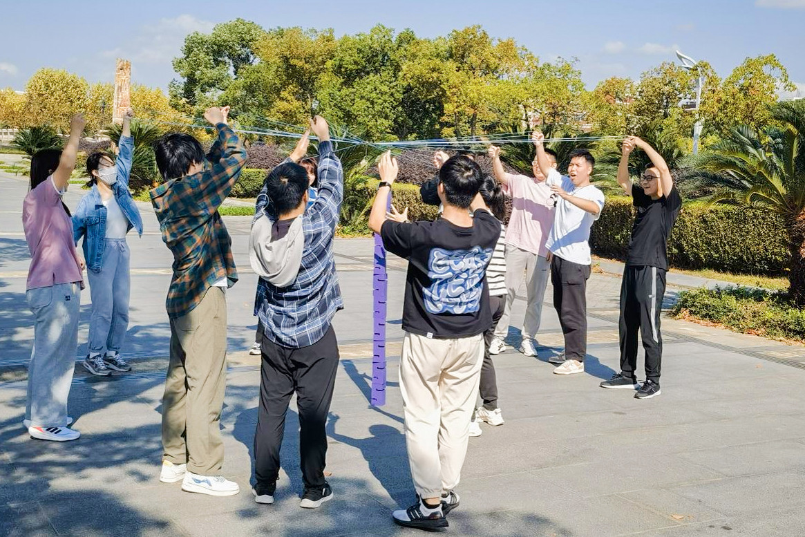 第三项活动是“环环相扣”,该游戏由队员间相互赞美引入,将队员围成的圆环转变成杂乱的“线团”,通过“线团”的拆解最终恢复成圆环,这个过程考验了团队成员的耐心与观察力,也培养了同学们在复杂的环境中静下心来慢慢解决问题的能力!