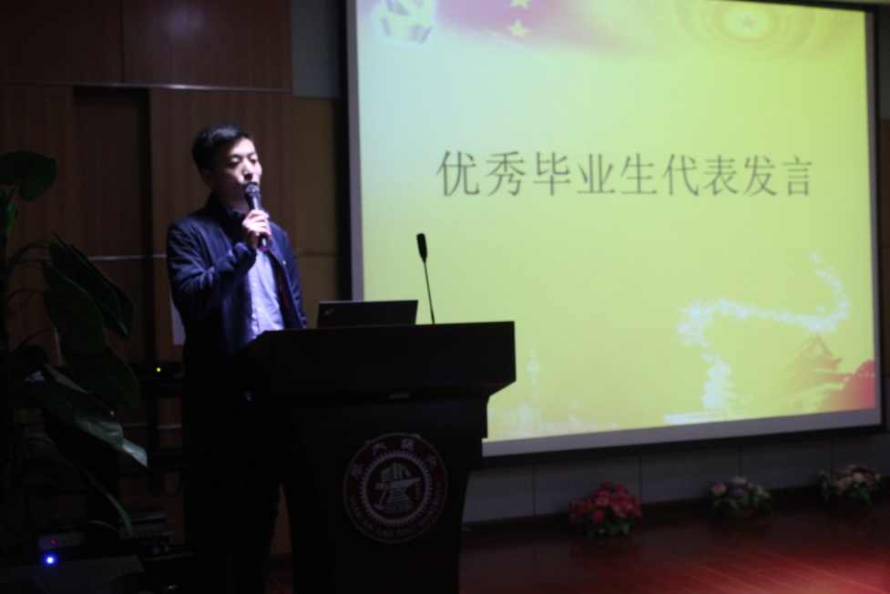 研究生会副主席刁金超和国奖获得者李硕同学分别就学生工作和科研创新作了发言。不忘初心,选择了交大,就选择了责任。接着,优秀毕业生代表孙凯芳就两年半以来在交大生活学习的点滴做了回顾。用习近平总书记的做可爱、可信、可贵、可为的“四可”青年作为总结,强调要从勤学、修德、明辨、笃实四方面不断砥砺磨炼自我。