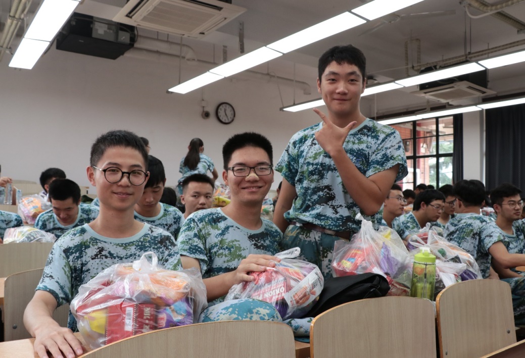 发言之后,贾金平书记、郑浩副书记为教官、同学们发放慰问品,将学院的关怀带给了刻苦训练的同学们。拿到慰问品的同学们喜上眉梢,有心急的同学马上打开享用了起来。