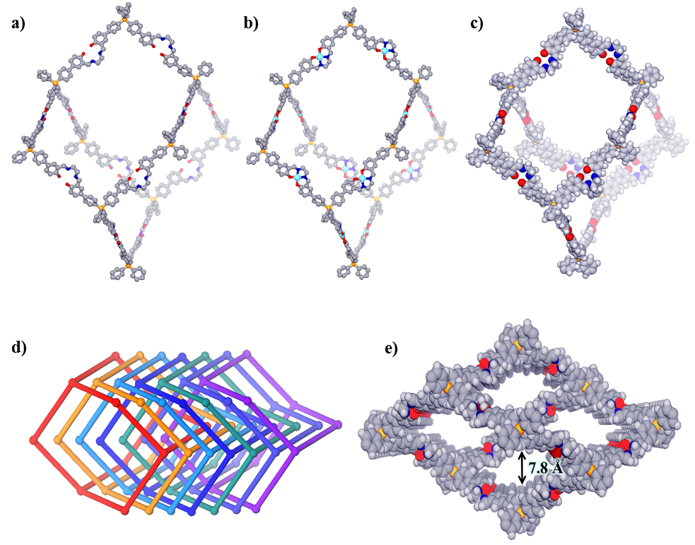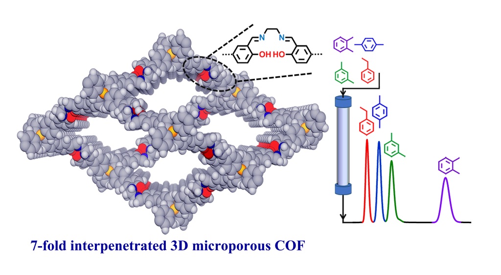 乙苯和二甲苯异构体由于具有极其相似的物理化学性质,因此其分离是当今世界七大最具挑战性的分离任务之一。微孔材料对于低碳烃类化合物和小分子的分离和纯化具有较好的效果。相比于二维COFs,三维COFs通常由于穿插结构的存在,导致其更容易形成开放性的微孔结构,因此设计合成具有微孔结构的三维COFs材料有着重大的研究意义。目前,MOFs已经被广泛地应用于分离乙苯和二甲苯方面的研究,然而有关COFs用于分离乙苯和二甲苯的研究尚未报道。 先前的研究工作证实,水杨醛功能化的单体能够和邻二胺单体组装得到三维 salen-COFs材料。黄金晶和韩星同学设计合成了两种具有四面体结构的水杨醛功能化单体Si-THBA和C-THBA,将其与乙二胺组装能够得到两种三维salen-COFs。组装过程中加入醋酸锌还可制得两种金属修饰的三维Zn(salen)-COFs。这四个同构的COFs拥有7重互穿的dia拓扑以及均一的微孔结构,孔径大小约为0.78 nm。将它们与硅胶进行混合,填充于不锈钢柱中,可用作高效液相色谱的固定相来实现乙苯和二甲苯异构体的分离,表现出良好的重复性和较高的柱效。未经金属修饰的三维salen-COFs由于孔道内含有大量裸露的salen单元,增大了对有机小分子的吸附能力,表现出更好的分离效果。此外,三维salen-COFs作为固定相还能高效地分离对二溴苯、乙基甲苯、氯甲苯、二乙苯的异构体。