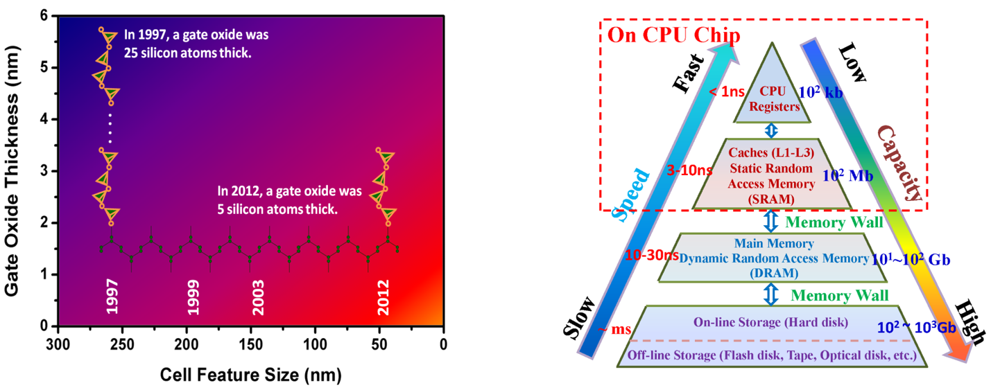 图1.(左)硅基半导体尺寸缩小趋势以及(右)多级存储结构示意图。