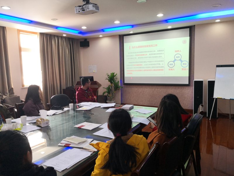 首先,金老师介绍了2019年春季学期入党积极分子考核、党员发展、预备党员转正的工作安排,并传达了学校组织部发展党员工作专项学习的精神,提出了新的标准,梳理了党员发展工作中的重点事项,总结了党员发展自查工作中存在的问题。