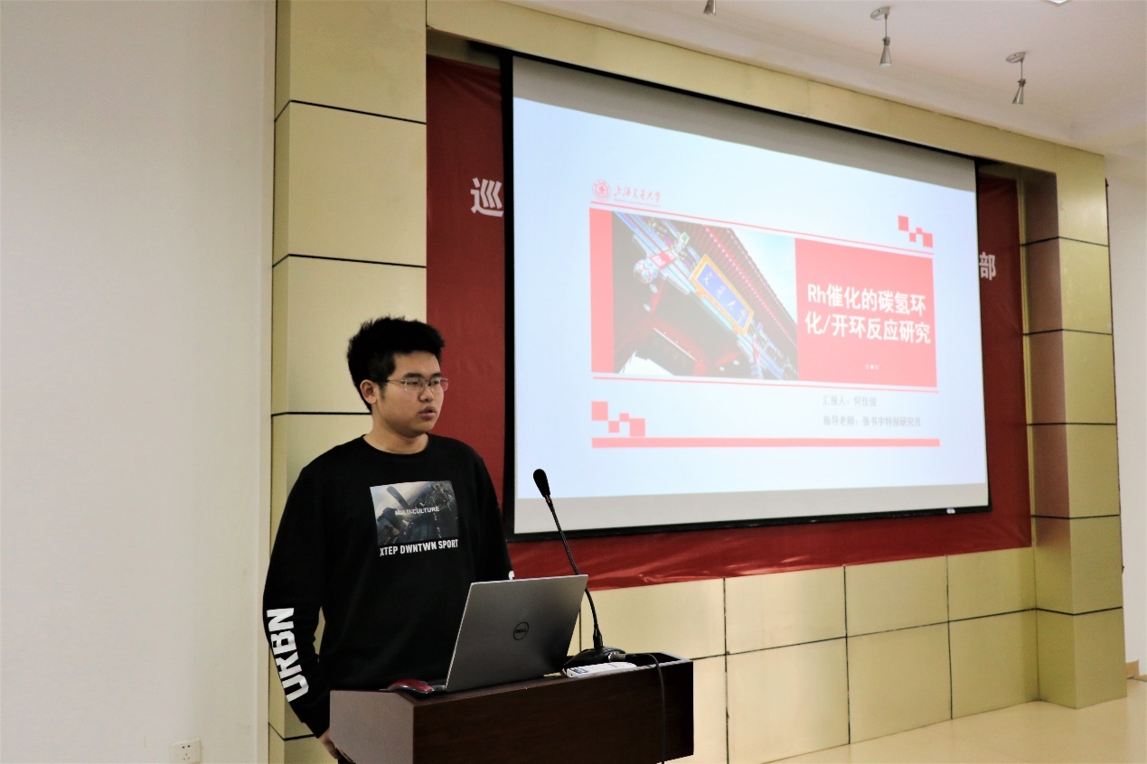 第六组进入汇报,由何佳俊同学介绍项目——“Rh催化的C-H活化/重排反应研究及其在荧光检测上的应用”,何佳俊同学介绍了该项目的研究背景、前置试验、机理研究和项目的总结。汇报结束后,彭红梅老师、钱雪峰院长、孟庆华老师、汪羽翎老师和参会同学就项目的具体细节提问,并提出宝贵建议。