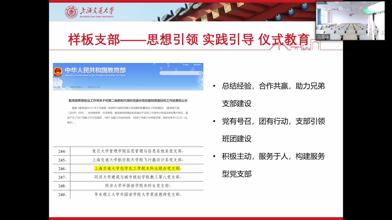 研究生党支部书记卞雅文代表研究生支部进行工作汇报。她从党员发展、支部建设、建设成果等三个维度进行了总结分享,通过严把党员发展入口、不断加强学生支部建设等工作方法,研究生党员先锋模范带头作用显著。