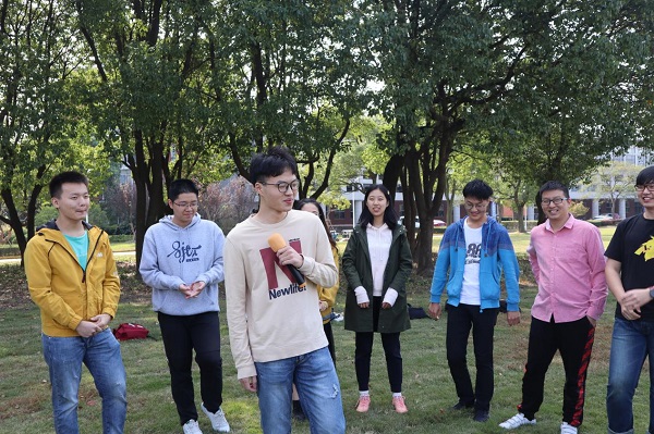 第二项活动是“松鼠与大树”。同学们以三人为一组组成“松鼠与大树”,根据“狼来了”、“着火了”、“地震了”等不同口令指示,同学们随机重组队伍,落单者成为下一轮的主持人接棒发布口令。几轮游戏过后,同学们不再拘谨,相互笑闹,初识的尴尬被逐渐打破,现场气氛开始活跃起来。