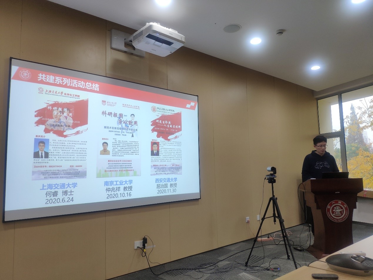 南京工业大学能源学院研究生党支部书记史玉涛为大家分享了时钧院士的家国情怀。他提到入党是时钧院士一生的夙愿,作为一名科研者和师者,时钧院士身体力行,为我国的化工事业做出了巨大贡献,也深刻诠释了“时钧精神”。最后史玉涛党支书倡议大家学习并传承“时钧精神”,成为一名有理想、有追求、有担当、有作为的新时代青年。